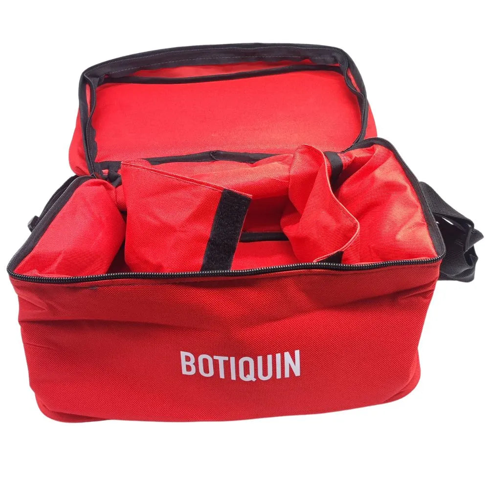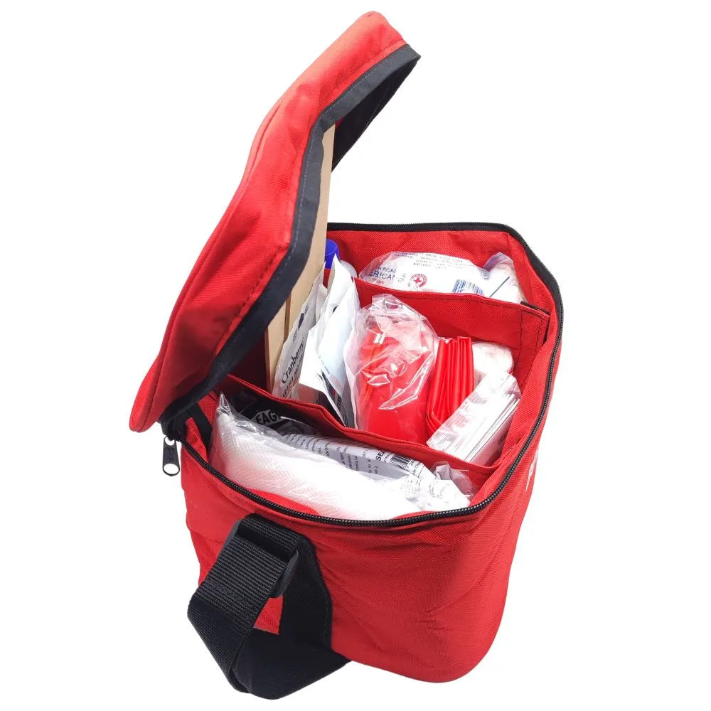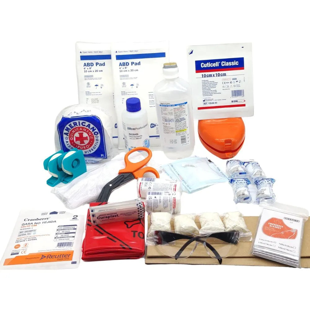 Kit de emergencias para faenas mineras Los Bronces, armado conforme al PNP.DLBGSCOP.0002 Anexo 10 y alineado a DS 594 (Chile). Diseñado para atención de primeros auxilios en terreno y vehículos de faena.