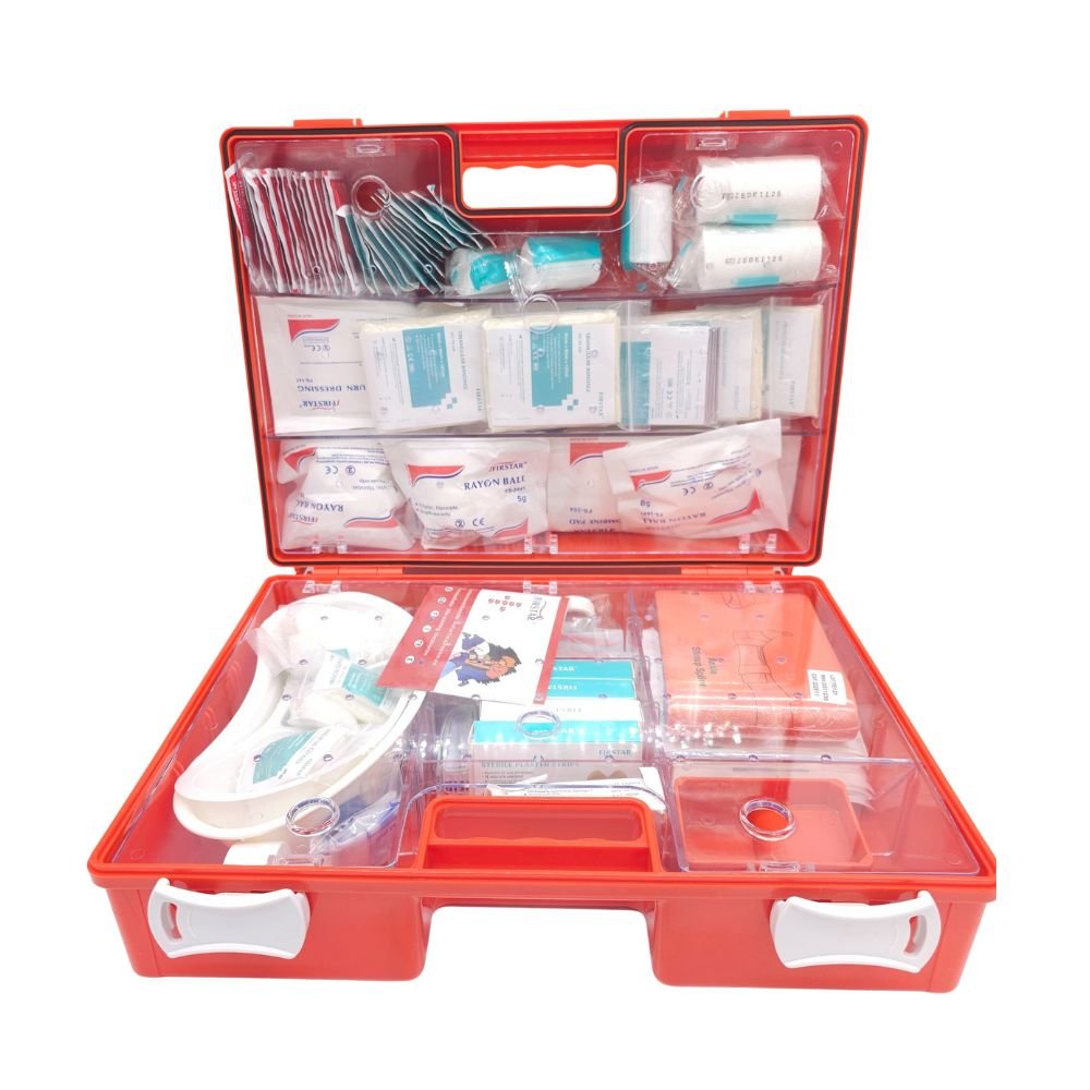 Solución integral de primeros auxilios diseñada para empresas e industrias con 100 o más trabajadores. Maleta ABS resistente con soporte mural incluido e insumos profesionales de grado hospitalario. Cumple normativa Ministerio de Salud Chile.