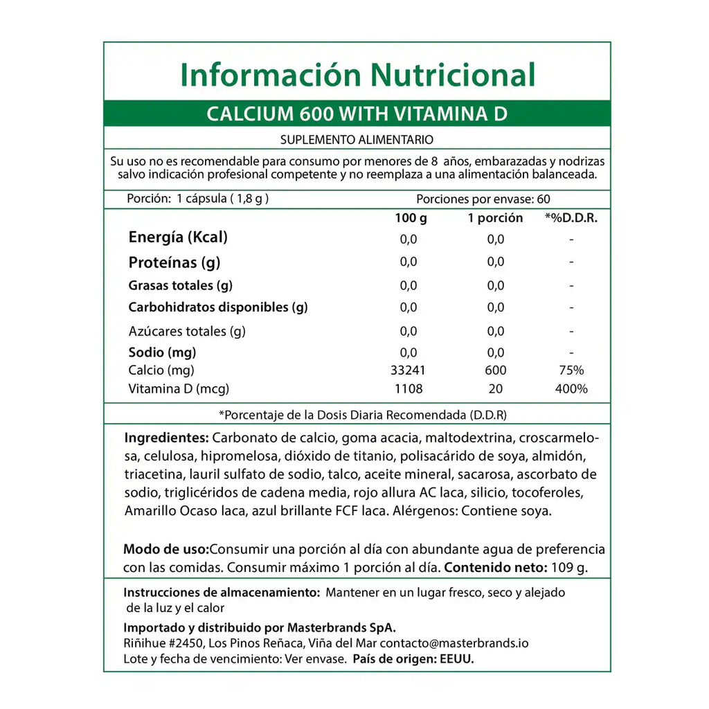 Ingredientes activos por cápsula: Calcio 600 mg (75% DDR) + Vitamina D3 20 mcg / 800 IU (400% DDR)