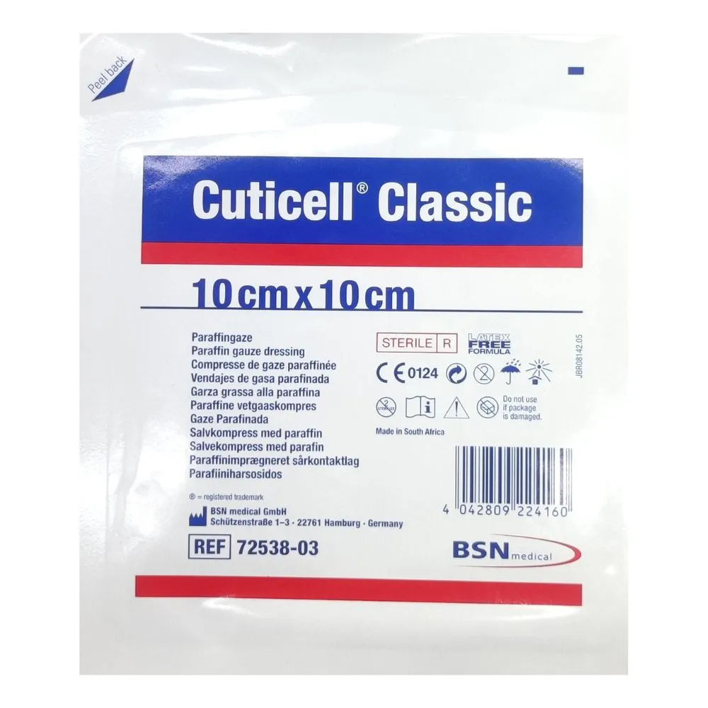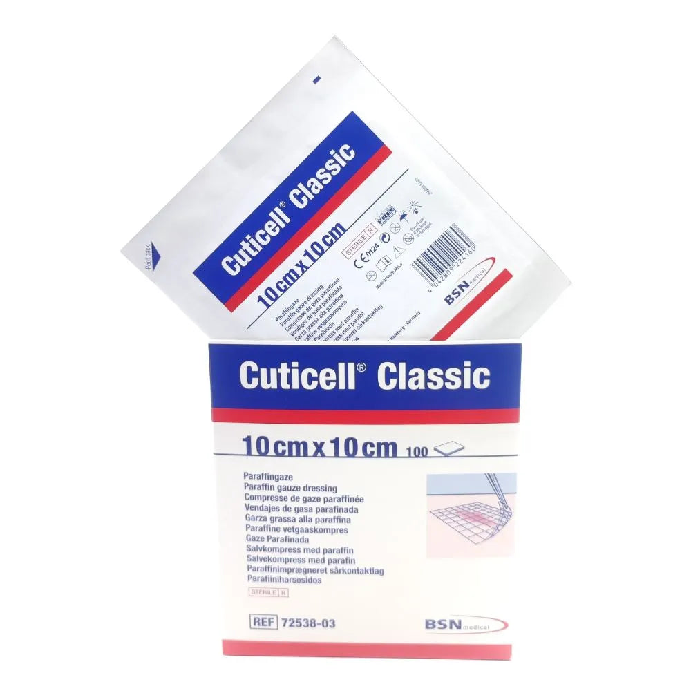 La gasa parafinada Cuticell Classic es un apósito estéril de calidad hospitalaria fabricado por BSN Medical (Alemania). Su impregnación con parafina blanca de grado médico crea una barrera suave y no adherente, ideal para cubrir zonas sensibles de la piel sin generar daño al cambiar el apósito.
