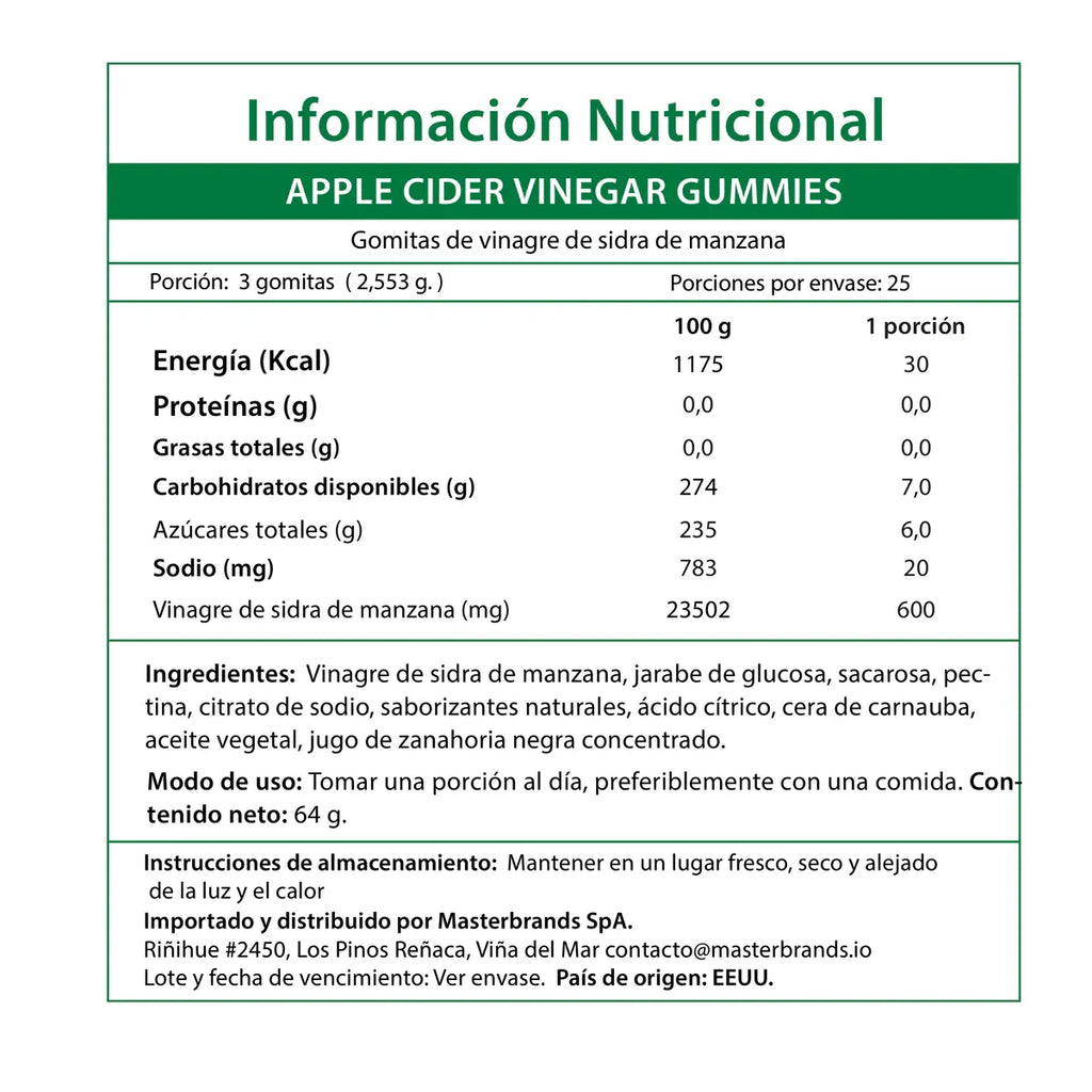 Porción: 2 gomitas = 600 mg de vinagre de manzana