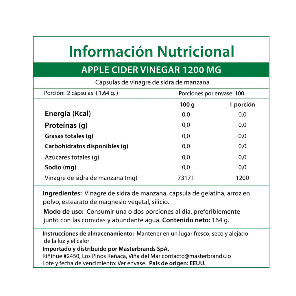 Ingrediente activo: Vinagre de manzana en polvo (equivalente a 1200 mg de vinagre de manzana fresco por porción)